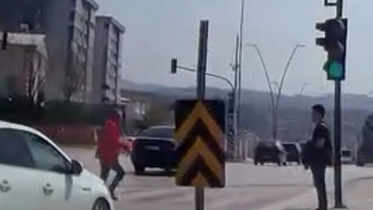 Nilüfer ilçesinde trafik ışıklarının araçlara yeşil yandığı sırada karşıya geçmek isteyen bir yaya, akan trafiğe aldırış etmeden yola çıktı.