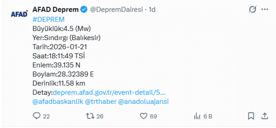 Afet ve Acil Durum Yönetimi Başkanlığı (AFAD) verilerine göre, saat 18.11'de merkez üssü Balıkesir'in Sındırgı ilçesi olan bir deprem gerçekleşti. Yerin 11.58 kilometre derinliğinde meydana gelen 4.5 büyüklüğündeki sarsıntı, Bursa başta olmak üzere Marmara Bölgesi'ndeki birçok ilde hissedildi.