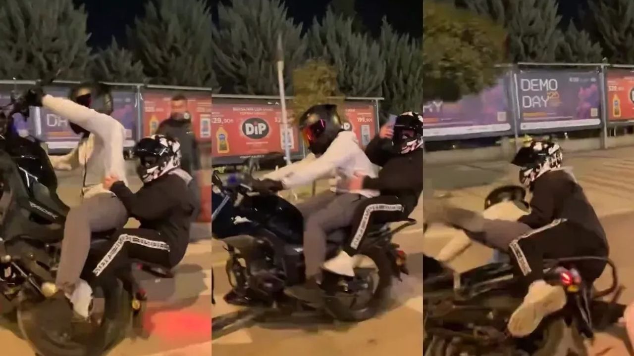 Kaza anı, çevredeki bir sürücünün cep telefonu kamerasına yansıdı. Görüntülerde, motosikletin ön tekerleğini kaldırmaya çalıştığı sırada devrildiği ve iki kişinin yola savrulduğu anlar yer alıyor.