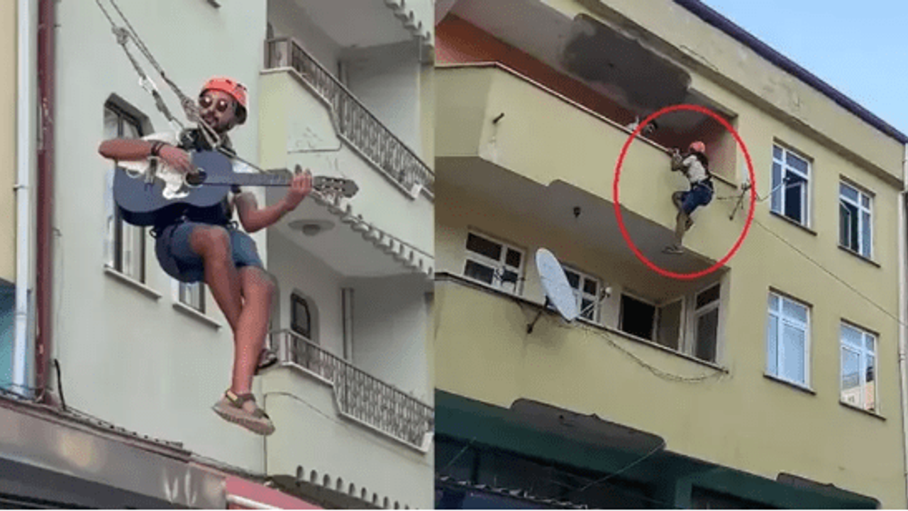 Besim Bora Baş, kendisi de eşyalarını taşıdığı yöntemi kullanarak aşağı indi. Emniyet kemerini takıp, gitar çalarak şarkı söyleyip 3’üncü kattan aşağı inen ve halat üzerinde öğrencilik yıllarının geçtiği eve veda eden Baş’ı, komşuları ilgiyle izleyip, cep telefonu kamerasıyla görüntüledi.