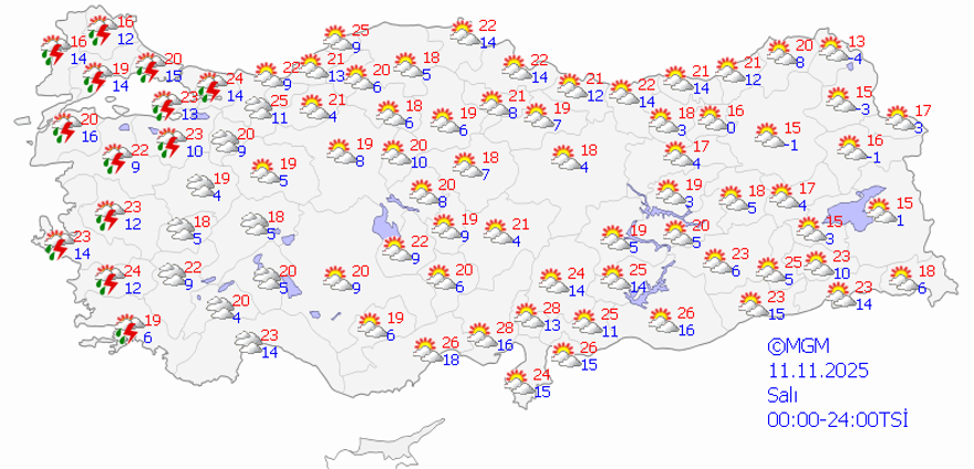 Meteorolojinin tahminlerine göre hafta ortasına kadar sıcaklıklar mevsim normallerinin üzerinde seyredecek. Salı gününden itibaren batıdan başlayarak hava sıcaklıkları düşecek, sağanak yağış başlayacak.