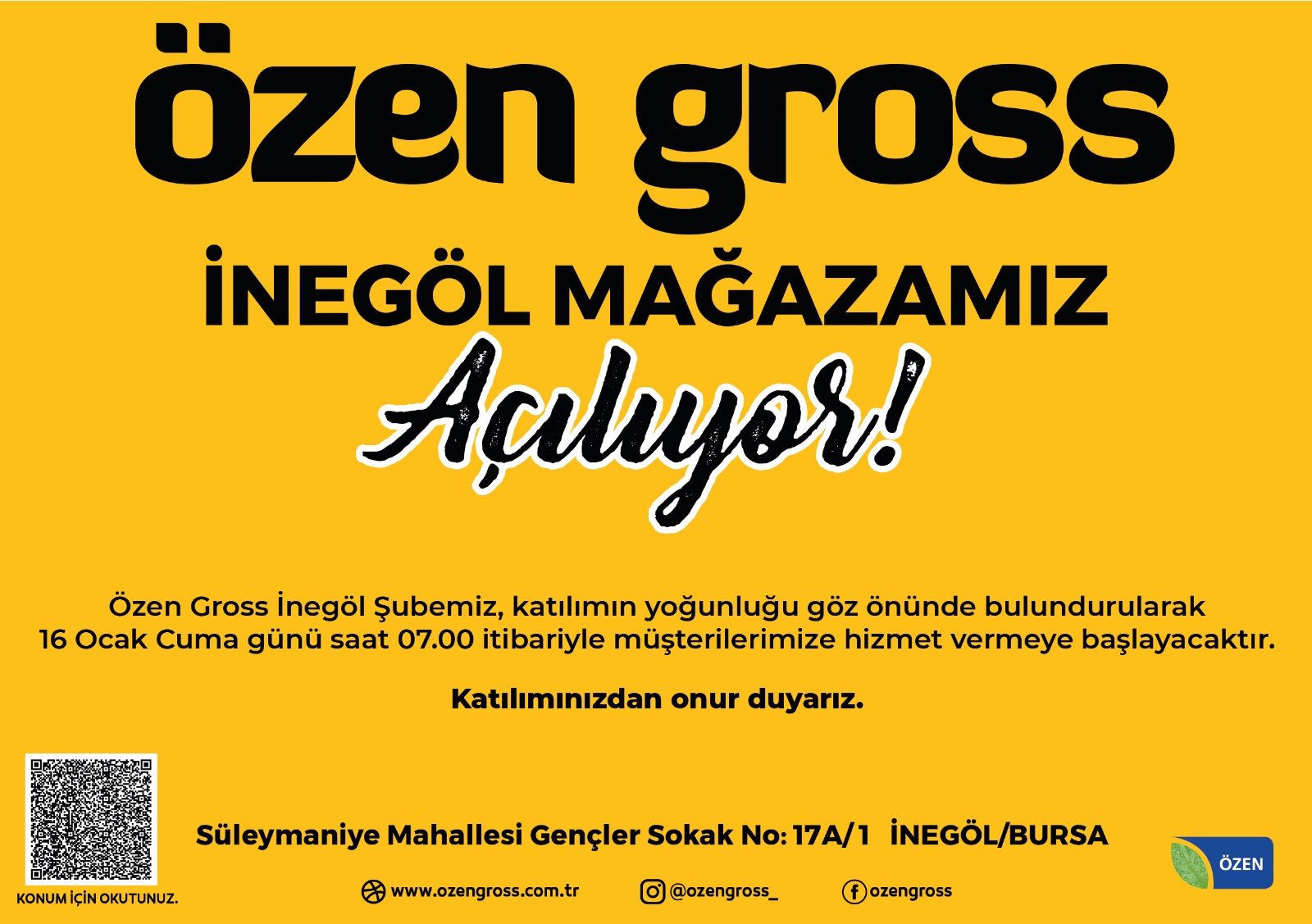 Ataevler, Erikli, İhsaniye ve Kütahya’da açılan mağazaların ardından İnegöl mağazasıyla birlikte beşinci şubesine ulaşan Özen Gross, toplamda 30.000 metrekarelik satış alanıyla faaliyet göstermektedir.