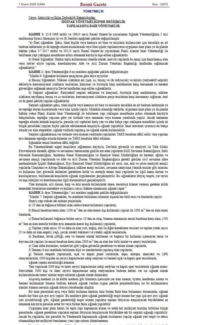 'Sığınak Yönetmeliğinde Değişiklik Yapılmasına Dair Yönetmeli' bugün Resmi Gazete'de yayımlandı.