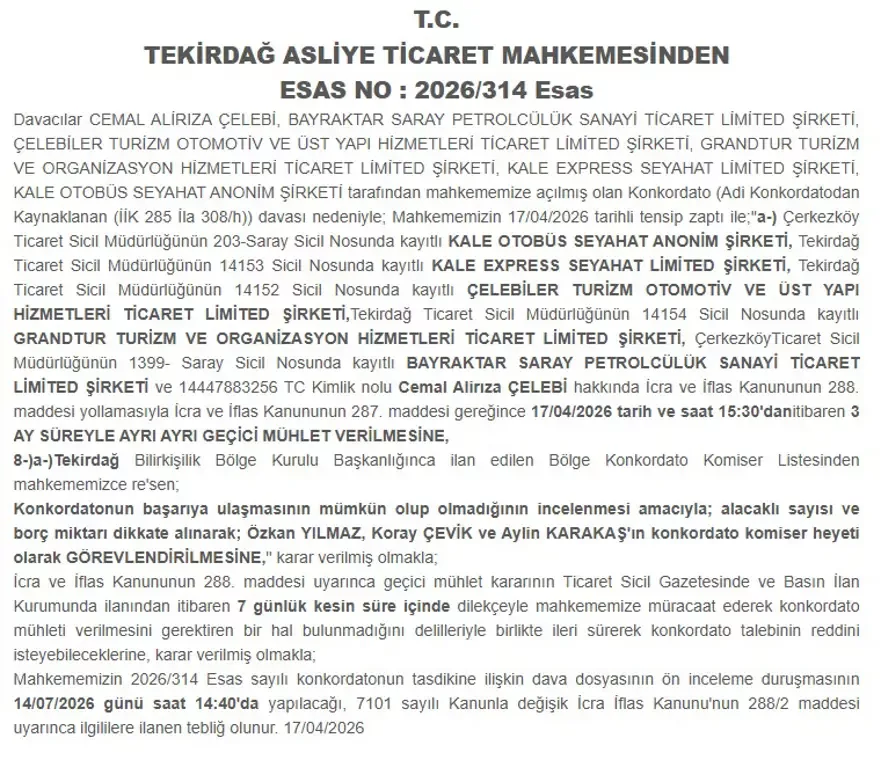 NTV'nin haberine göre, Tekirdağ Asliye Ticaret Mahkemesi, Kale Seyahat ve bağlantılı şirketlere geçici konkordato ilan etti. Cemal Alirıza Çelebi, Bayraktar Saray Petrolcülük, Çelebiler Turizm Otomotiv, Grandtur Turizm, Kale Express Seyahat, Kale Otobüs Seyahat şirketlerine 3 ay süreyle geçici konkordato mühleti verildi.