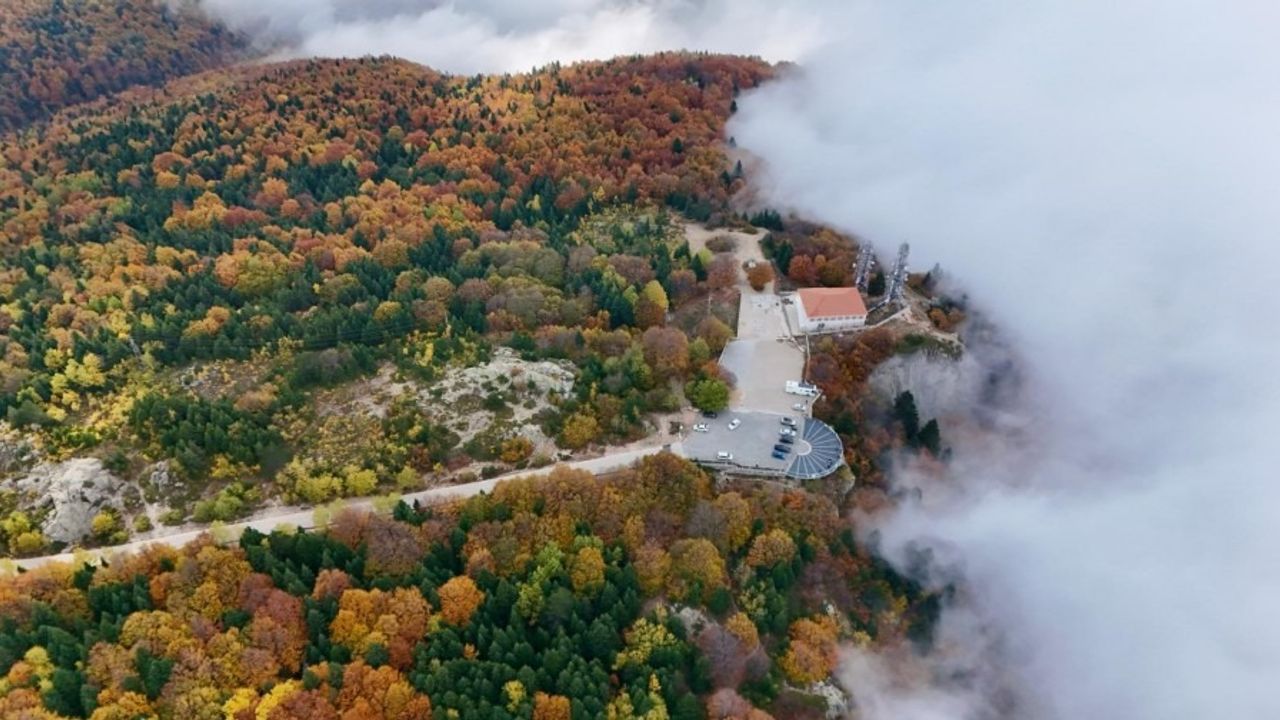 Türkiye'nin ilk kayak merkezi olan ve 'beyaz cennet' olarak tanımlanan Uludağ'ın Bakacak mevkisindeki seyir tepesinde, sararan ağaçlar ve oluşan sis tabakası güzel görüntüler oluşturdu. Doğaseverlerin de ilgi gösterdiği manzara, dronla havadan görüntülendi.