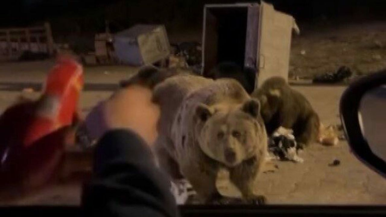 Ayılara uzaktan yiyecek atmak yerine sucuğu eliyle yedirmeye çalışan vatandaş, büyük bir tehlike ile karşı karşıya kaldı. Sucuğun kokusunu alan ayılardan biri aniden vatandaşın aracına doğru hamle yaptı.